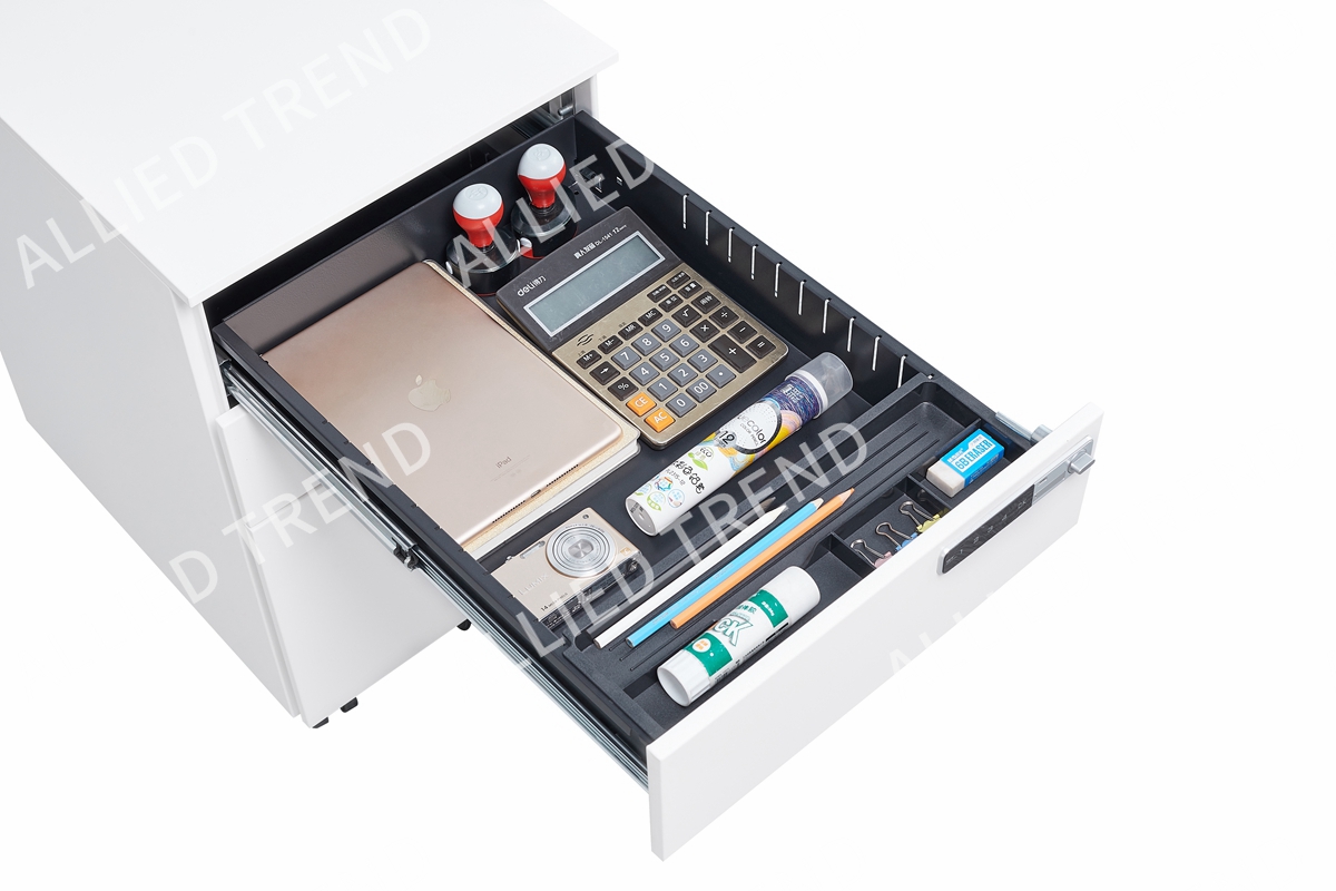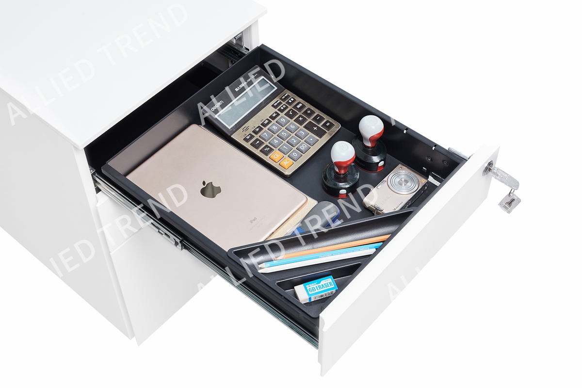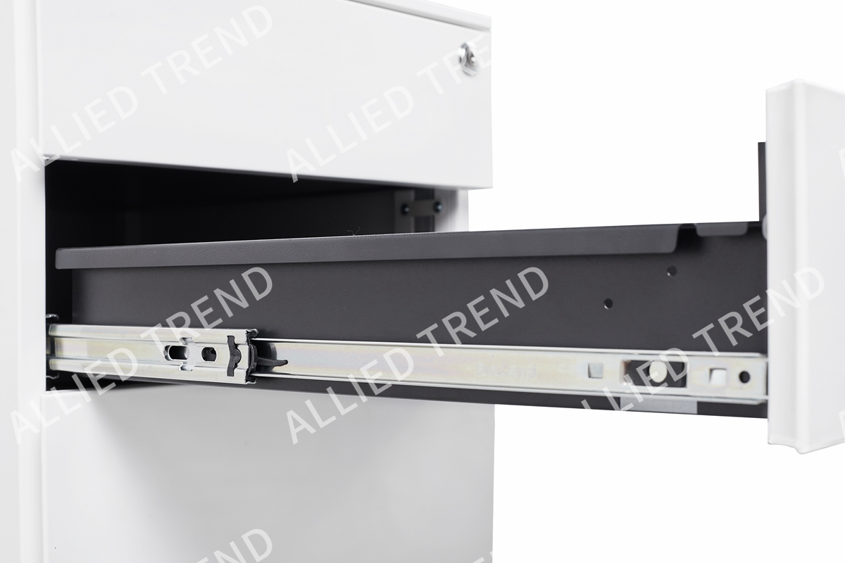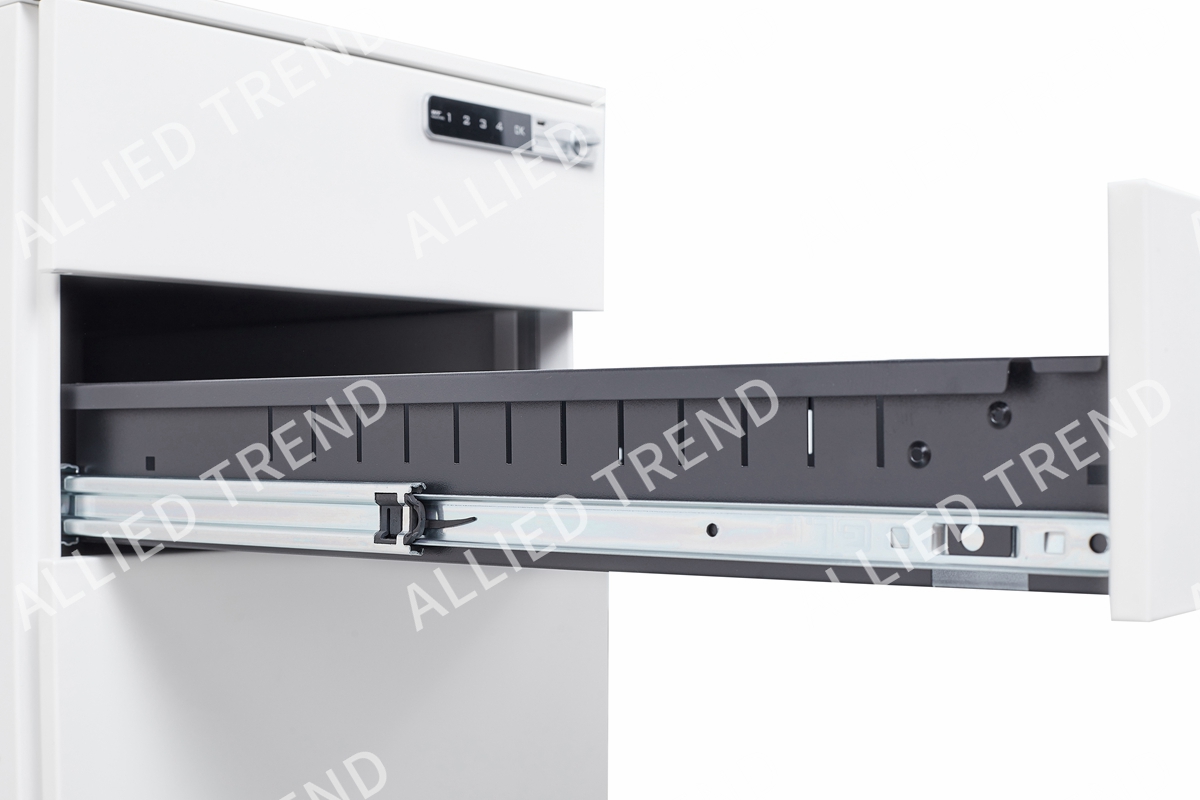 high-quality cold-rolled steel plate, environmentally friendly electrostatic spraying, 3-section silent sliding rail, high-quality load-bearing universal wheel, fully extended load-bearing drawer, anti-tipping device, mechanical lock, password lock (optional), stationery box, file rack adjustment rod, seat cushion (optional)