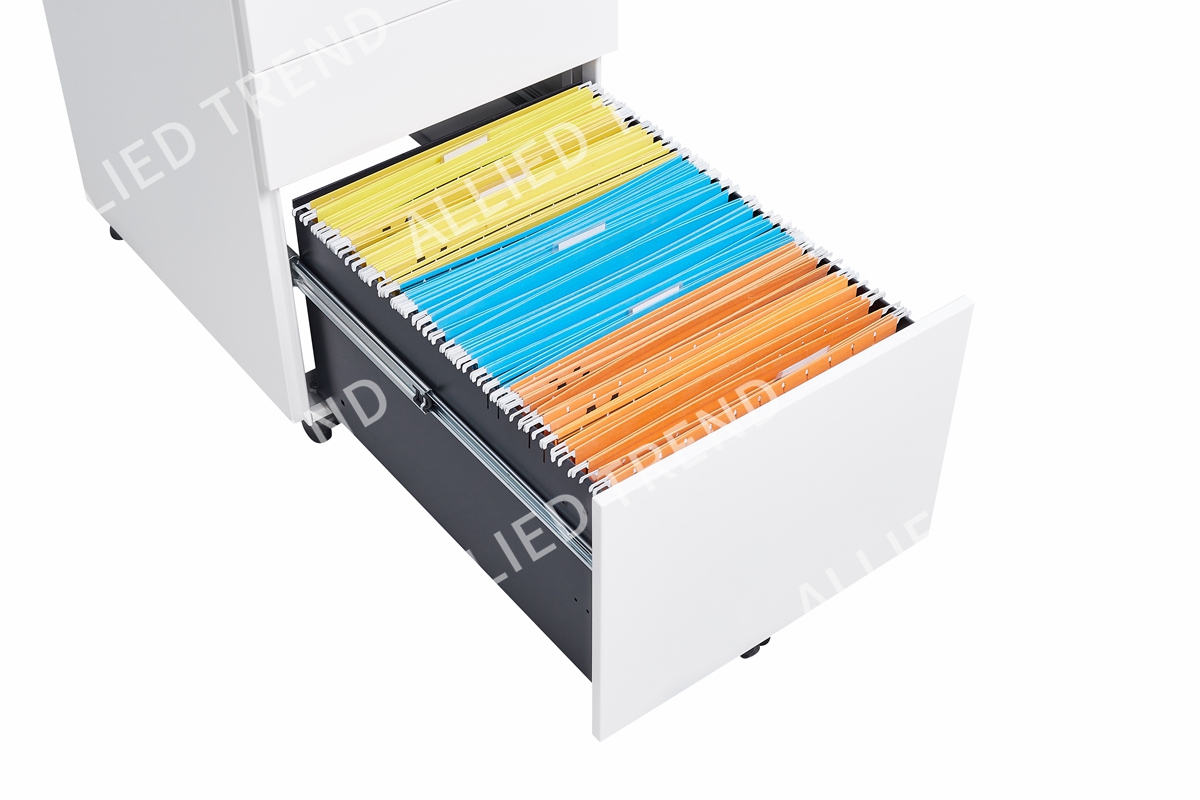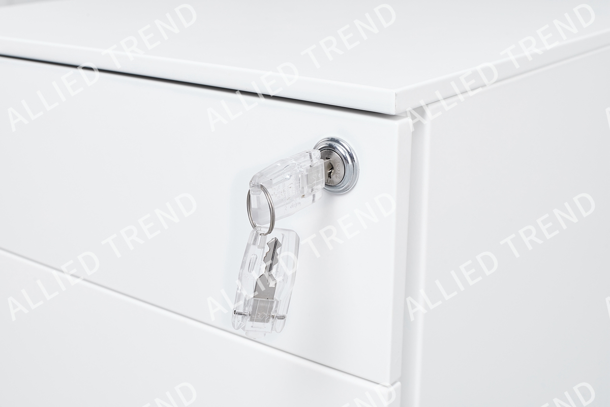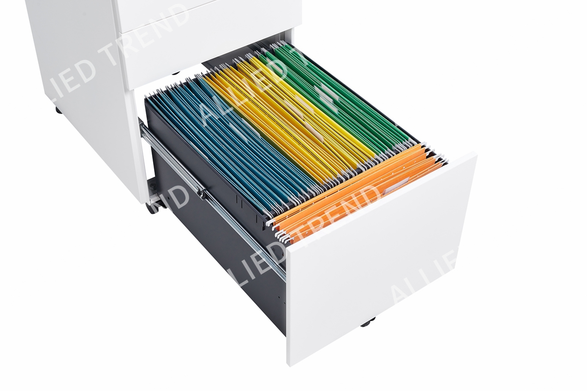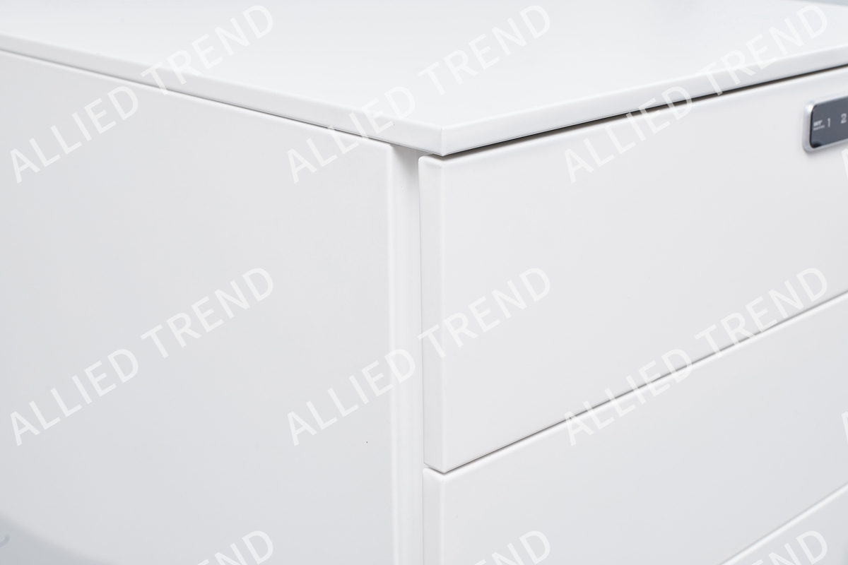 high-quality cold-rolled steel plate, environmentally friendly electrostatic spraying, 3-section silent sliding rail, high-quality load-bearing universal wheel, fully extended load-bearing drawer, anti-tipping device, mechanical lock, password lock (optional), stationery box, file rack adjustment rod, seat cushion (optional)